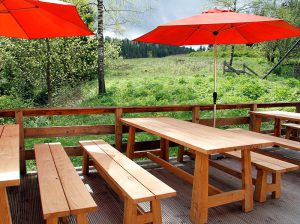 - Große Südterrasse mit Tischen und Bänken für 24 Personen